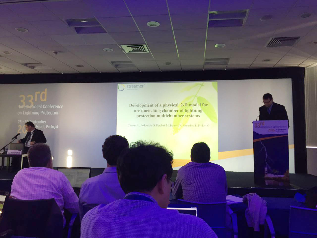 Streamer delegation was presented by George Podporkin, Alexander Nefedov, Alexander Chusov, and Dmitry Belko. The report of Alexander Chusov Development of a physical 2-D model for arc quenching chamber of lightning protection multichamber systems was included in the main program of the section called “Lightning protection of power systems”. Alexander told about the study of natural phenomena which take place in the discharge chamber; he also generalized results of investigations of a scientific unit of the Streamer company, as well as about investigations of physicists of the Rappersville University in Switzerland and the Institute of electrophysics and electrical energy industry of the Russian Academy of Sciences.