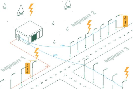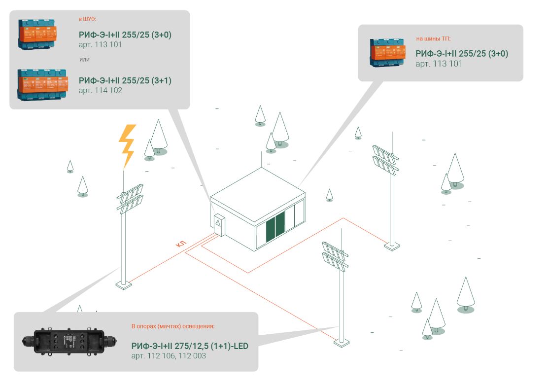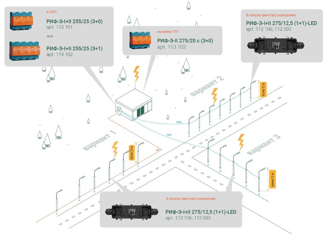 Если линия освещения выполнена КЛ на опорах высотой >10 м или СИП на опорах любой высоты, экранированных на протяжении всей трассы – УЗИП РИФ-Э-I+II 275/12,5 (1+1)-LED, УЗИП РИФ-Э-II+III 385/5 (1+1)-LED.