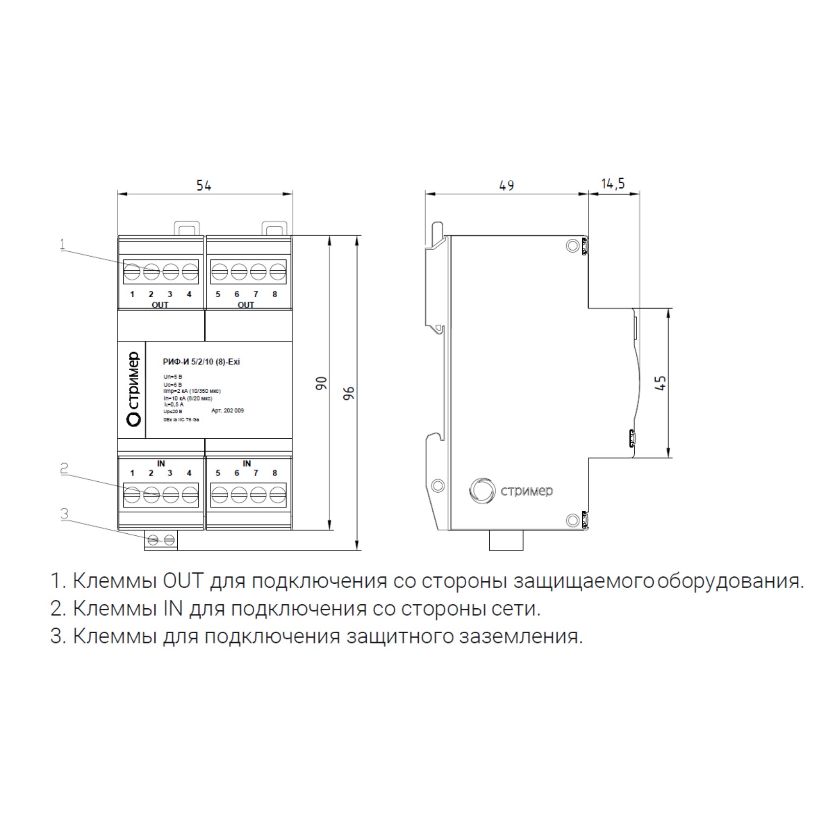 УЗИП размещено в корпусе шириной 54 мм для крепления на DIN-рейку.