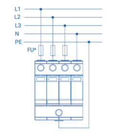 Устанавливается в пределах 0А(В) – 1 зон молниезащиты (в соответствии с ГОСТ Р МЭК 62305-1 и СО-153-34.21.122). Предназначено для защиты фазных и нулевого проводников L/PE, N/PE от перенапряжений «провод-земля»..