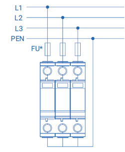 Предназначено для защиты фазных проводников L/PEN от перенапряжений «провод-земля».