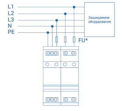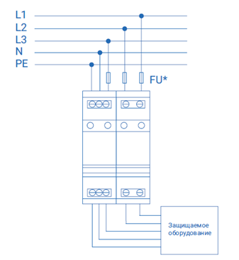 Устанавливается после УЗИП класса II в пределах 2–3 зон молниезащиты (в соответствии с ГОСТ Р МЭК 62305-1 и СО-153-34.21.122) непосредственно вблизи защищаемого оборудования. Защищаемое оборудование рекомендуется размещать на расстоянии не более 5 м от УЗИП класса испытаний III.